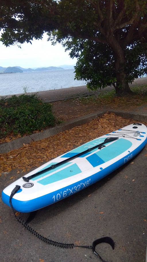 サップって色々あるけど、僕が使ってるのはこの安価なセット。3万円ちょっとでパドル・カヤックシート付き、インフレータブル(空気式)で持ち運びも楽だから、車に積んで海へ直行できます。