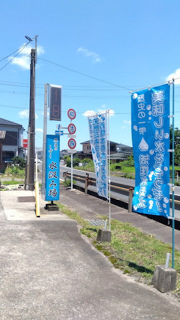青い旗と、山あいの静かな水汲み場。地味だけどどこか癒やされる雰囲気。